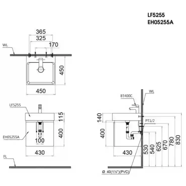 • Kích thước lavabo LF5255 : 450 x 450 x 115 mm (rộng x dài  x cao)