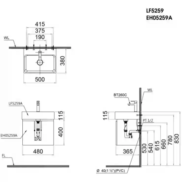 • Kích thước lavabo LF5259 : 380 x 500 x 115 mm (rộng x dài  x cao)