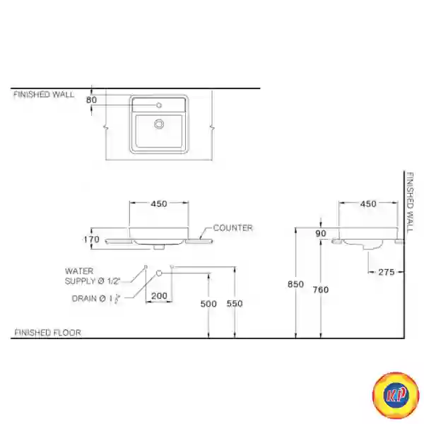 Bản vẽ kích thước chậu lavabo cotto C 003817 WH đặt bàn