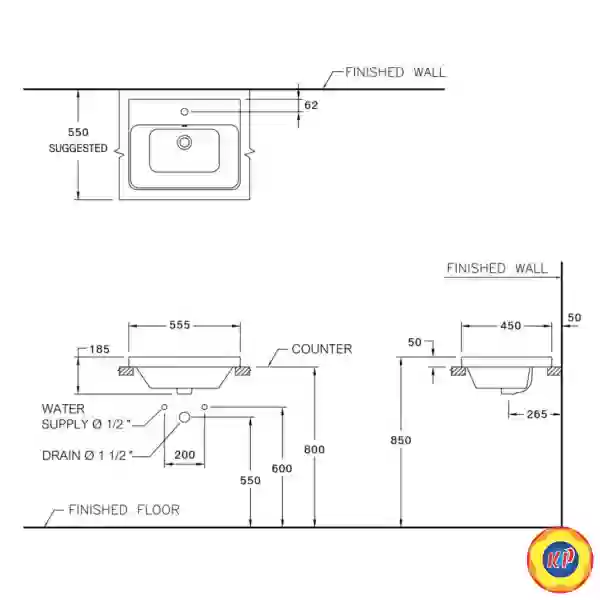 Bản vẽ kỹ thuật chậu lavabo đặt bàn Cotto C001057